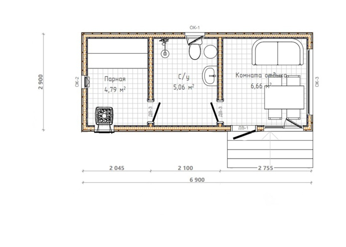 Компактная баня с комнатой отдыха с большими панорамными окнами для лучшего обзора вашего участка и очень просторным санузлом, где есть не только душ, но и унитаз, и раковина.