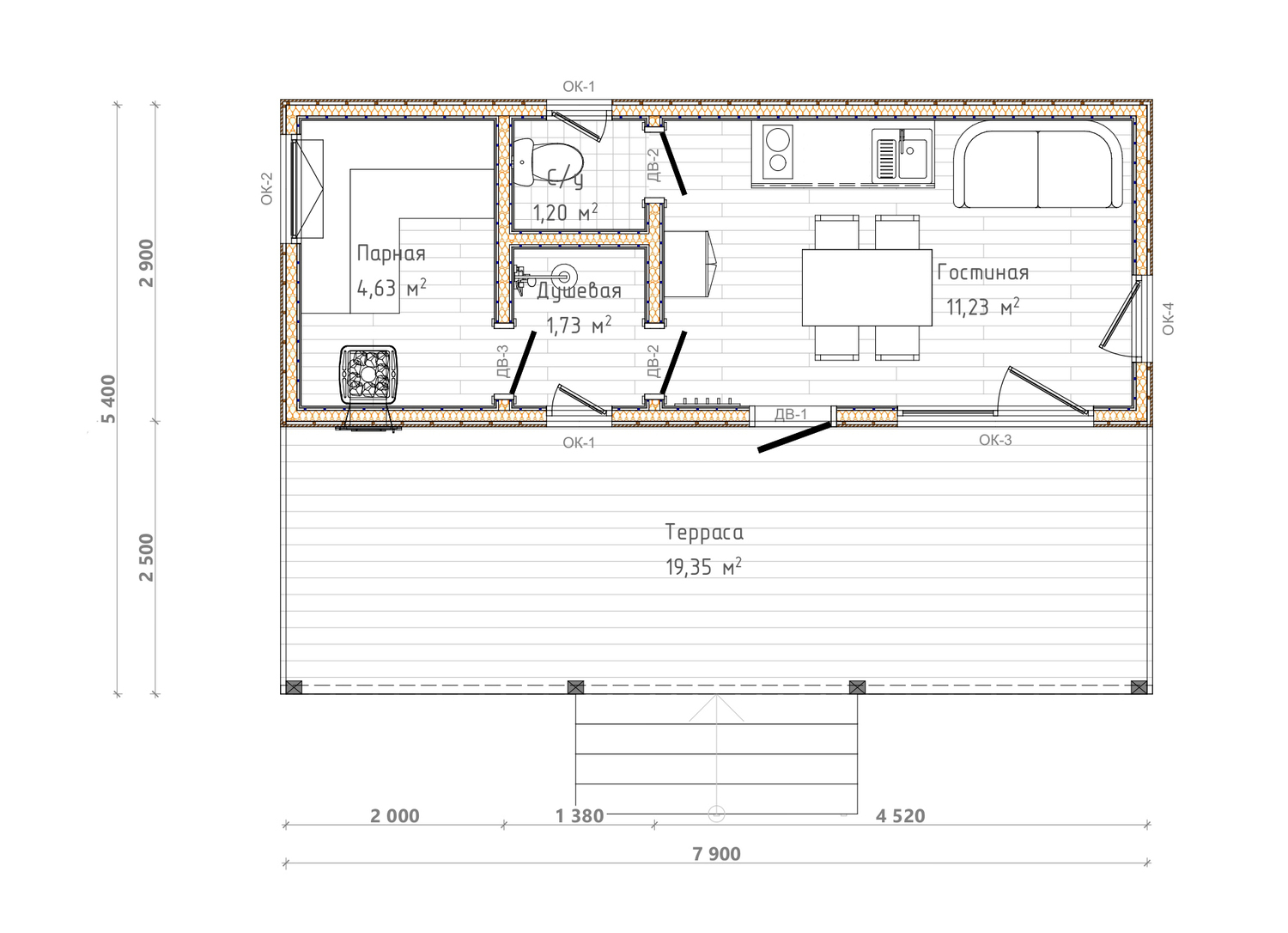 Модульная баня с раздельным санузлом, просторной комнатой отдыха и с большой крытой террасой.