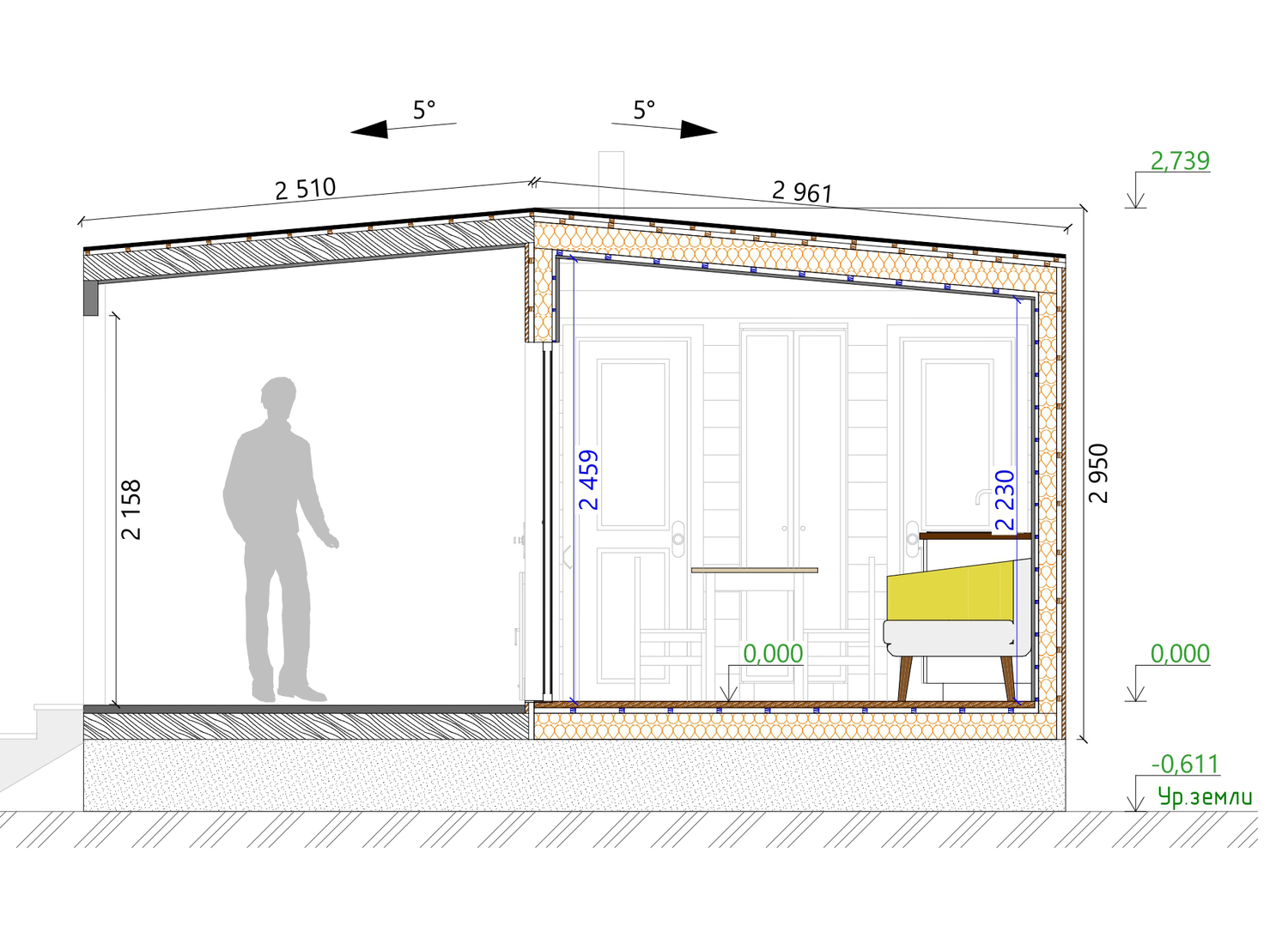Утепление: Стены 100мм, пол и кровля 150мм.
