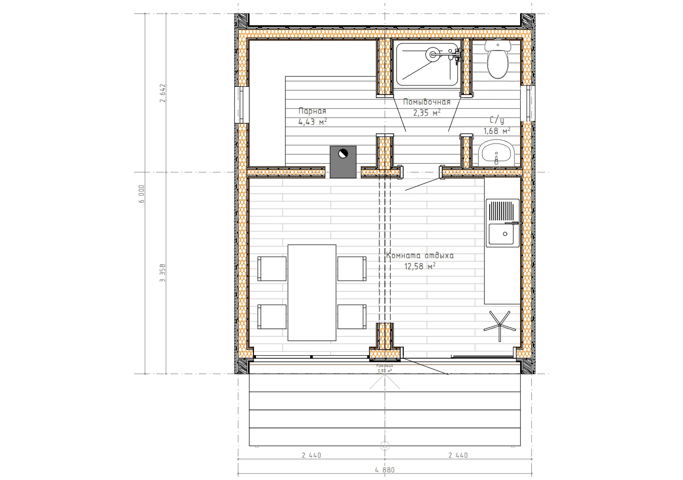 Эту баню с лёгкостью можно использовать и как отдельно баню, и как жилой дом с парной (постоянный, временный, гостевой, для сдачи в аренду (глемпинг), так как она имеет просторную комнату отдыха в которой с лёгкостью разместится кухня и зона отдыха с раскладным диваном. Дополнительным плюсом является раздельный сан.узел для большего комфорта.