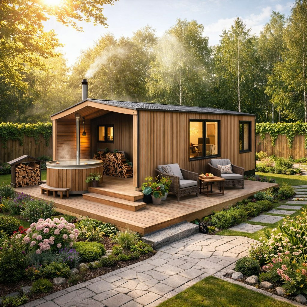 Базовая комплектация "заходи и парься" включает в себя полностью готовую для использования баню с утеплением, кровлей, окнами и дверьми, внешней и внутренней отделкой, а так же электрикой (освещение, розетки, выключатели), сантехникой (унитаз, душевой уголок, раковина с тумбой и накопительный водонагреватель). Но самое главное - дровяную банную печь-камин и парную с полками. Монтаж на участке так же включён в стоимость.