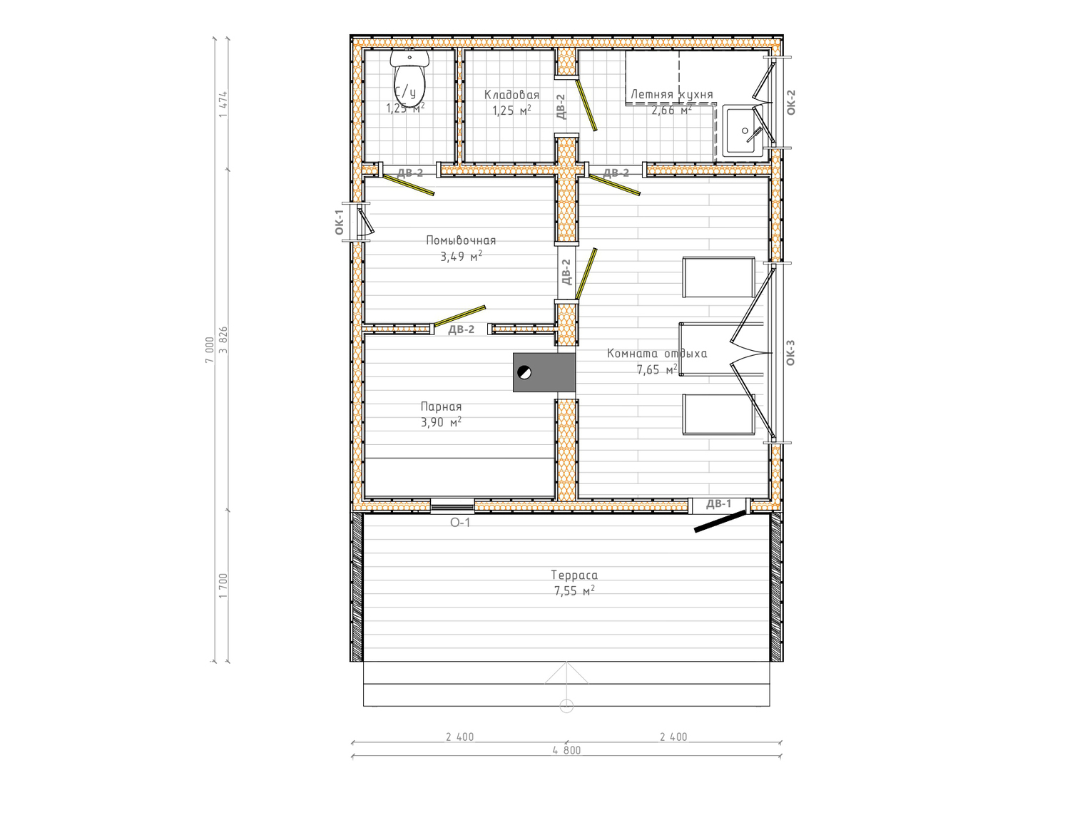 Баня с летней кухней и крытой террасой общей площадью 27м2.