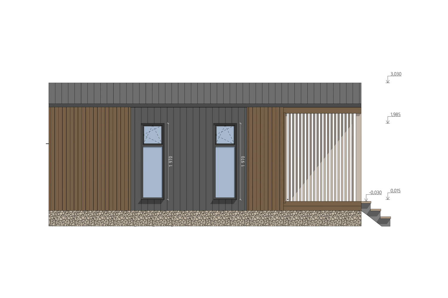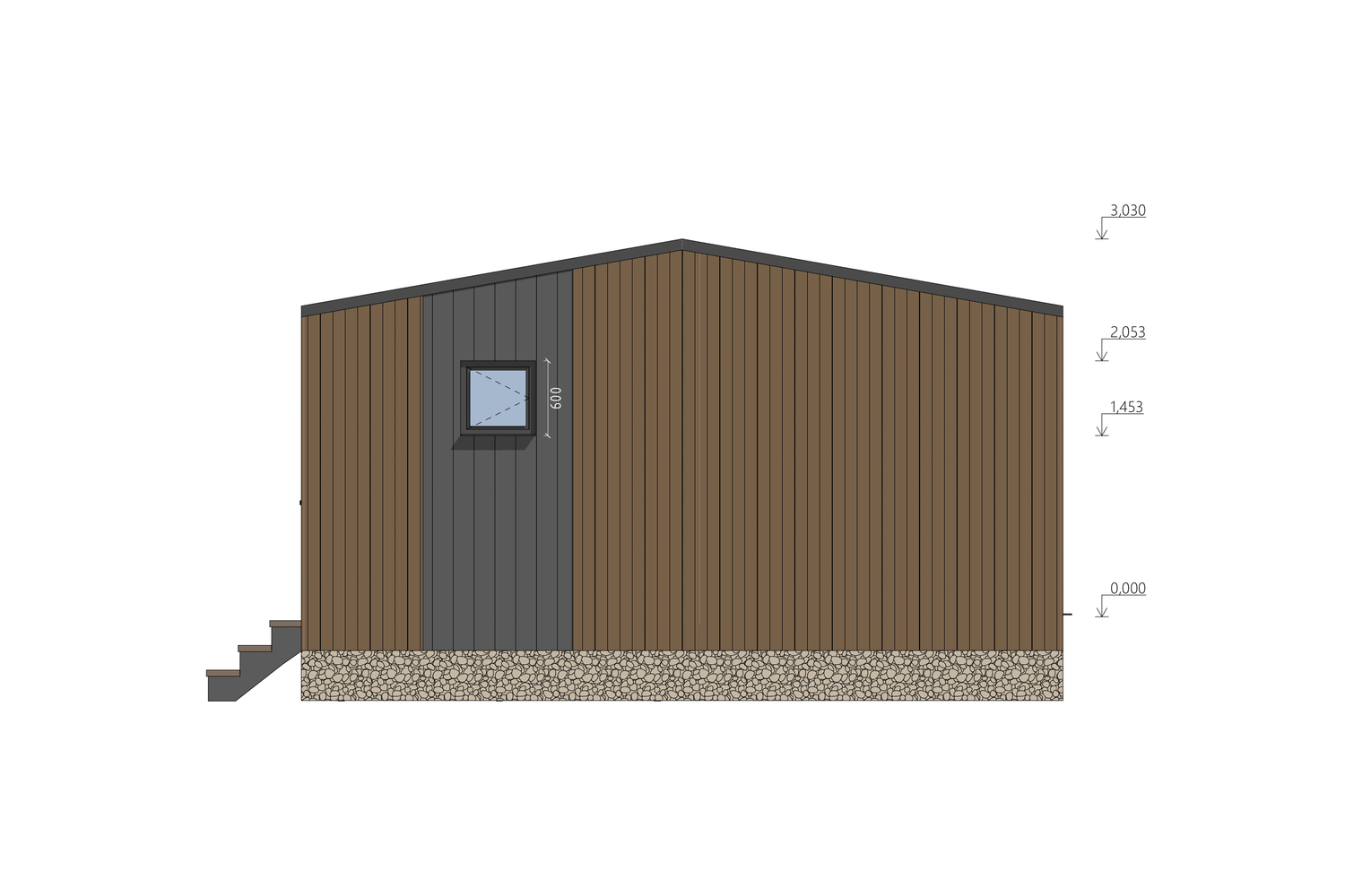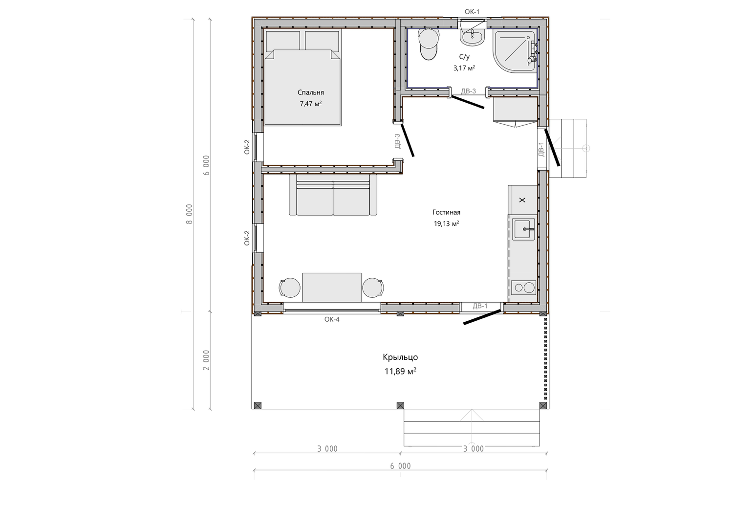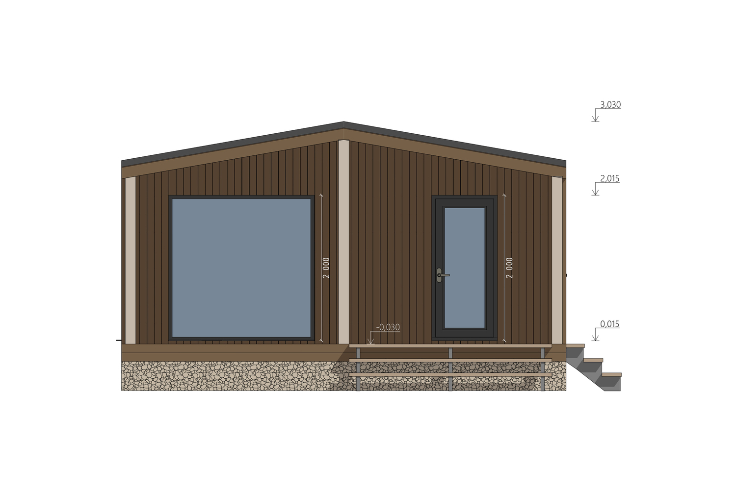 Отличный вариант для комфортного проживания двух человек, а так же отлично подойдёт для глемпинга. В данном проекте просторная кухня-гостиная площадью 19м2, небольшая отдельная спальня и совмещённый санузел. Отдельный вход организован сбоку, что позволяет сделать отдельную прихожую.