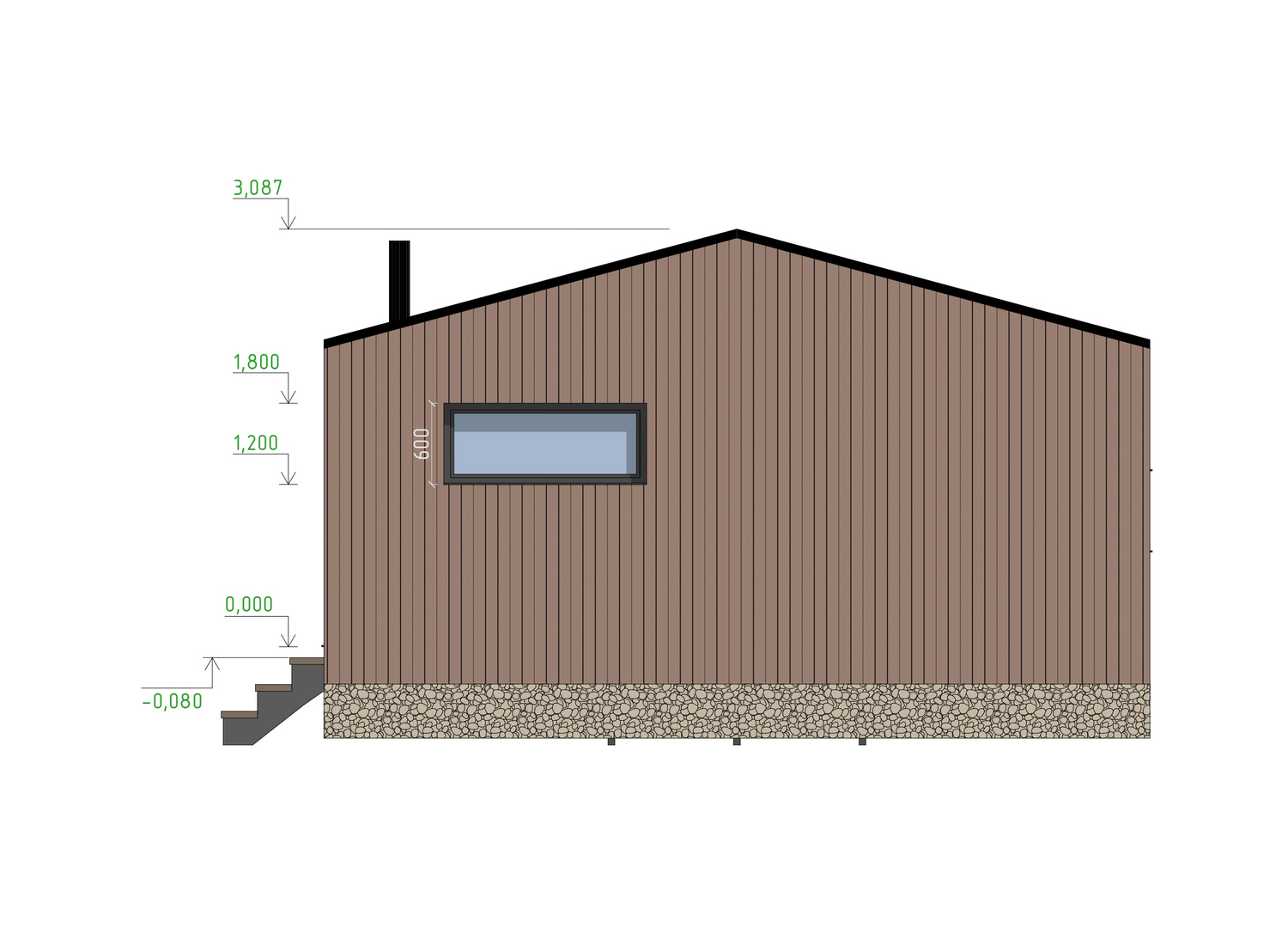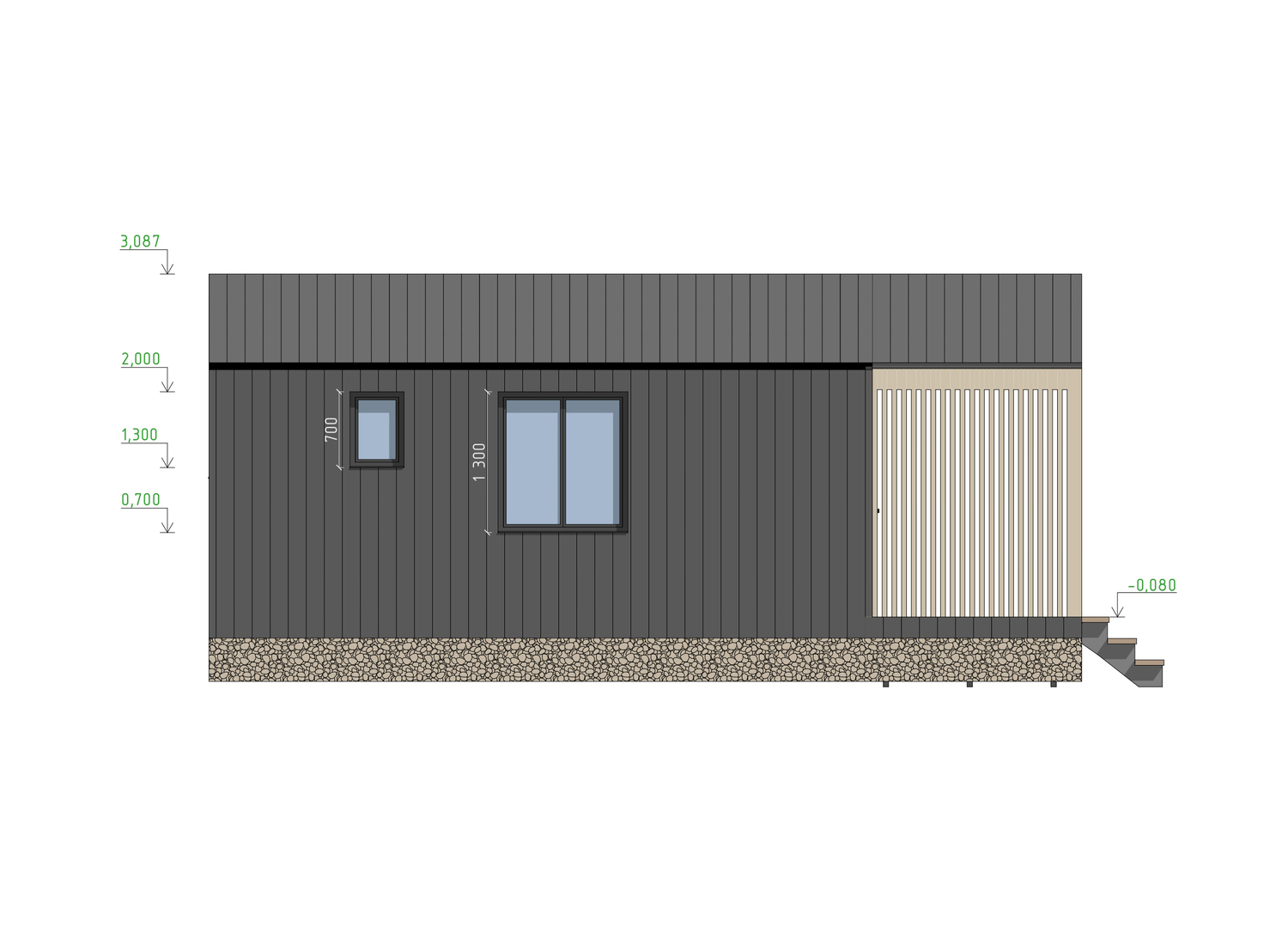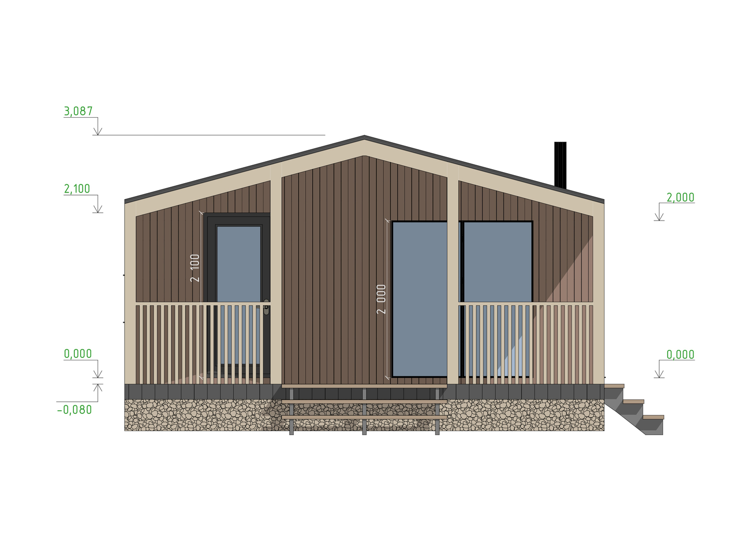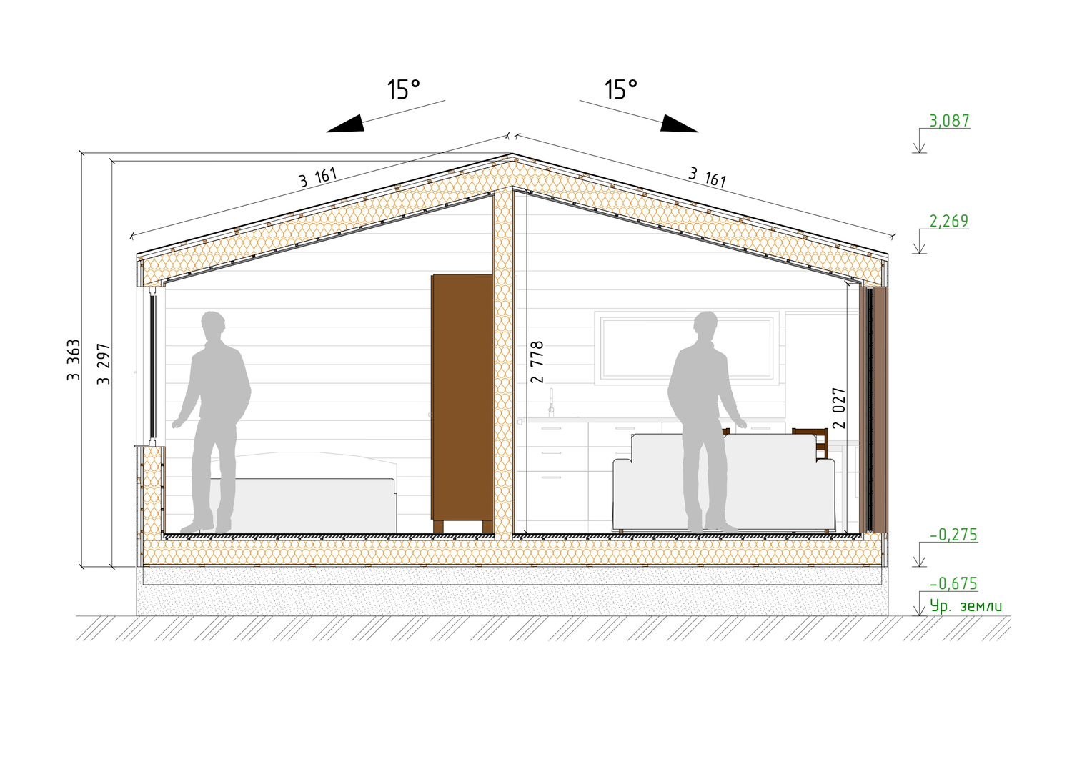 Отличный вариант для комфортного проживания двух человек, а так же отлично подойдёт для глемпинга. В данном проекте кухня-гостиная площадью, небольшая отдельная спальня, довольно большой совмещённый санузел и прихожая, которую можно отделить от кухни-гостиной дверью, создав дополнительное препятствие для холода.