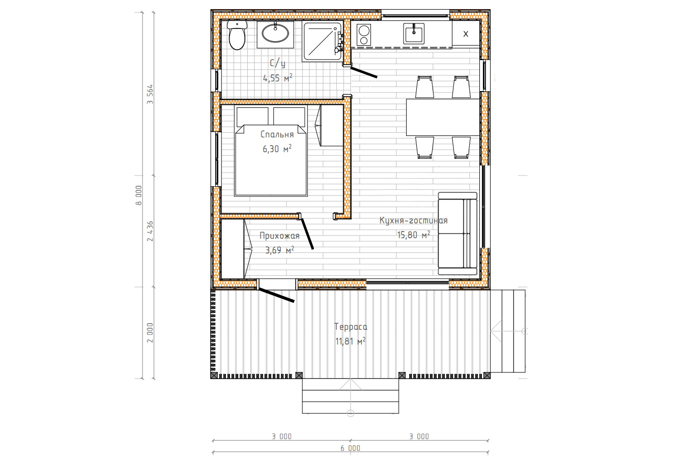 Модульный дом с одной спальней площадью 42м2 с крытой террасой.
