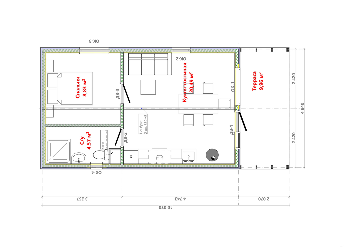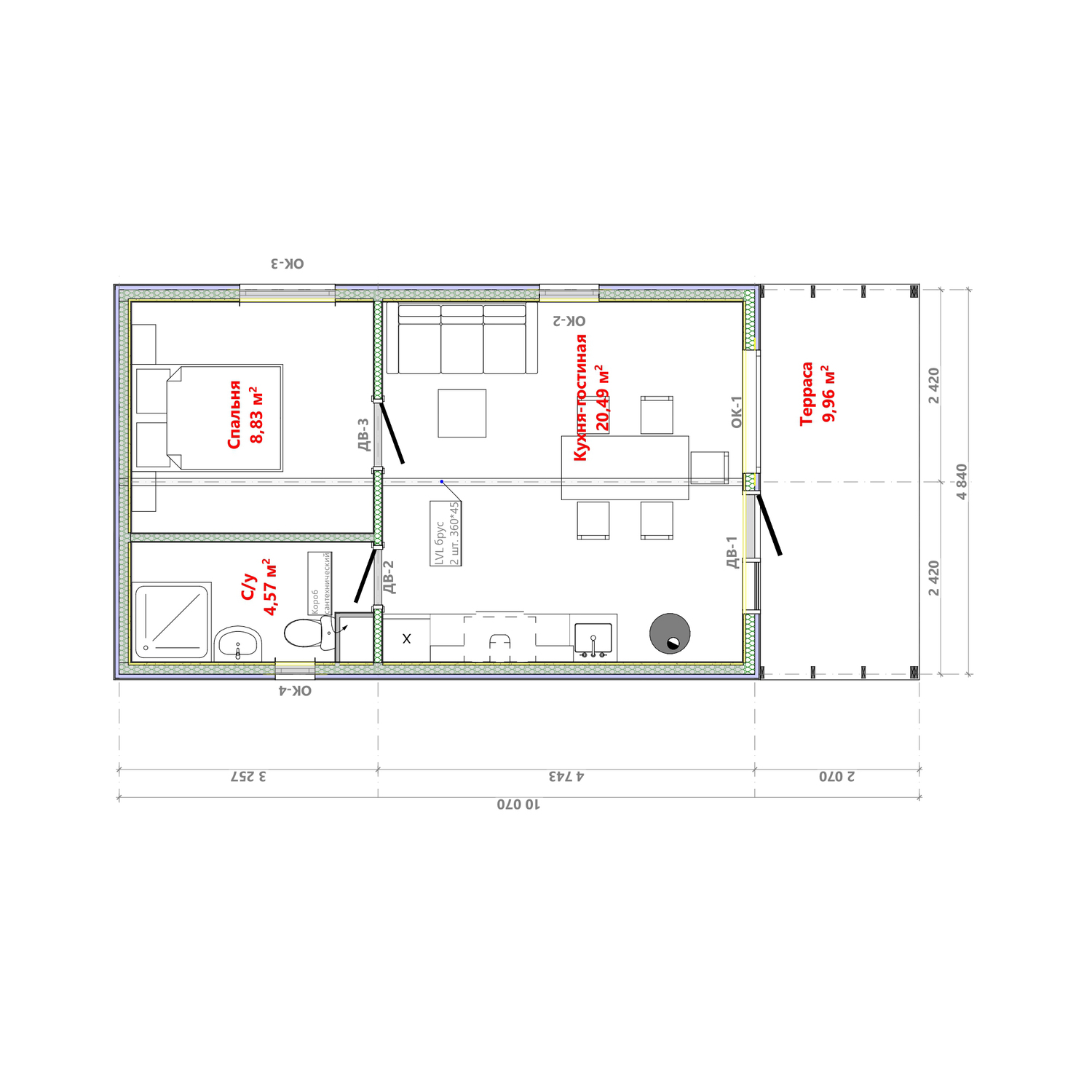 Благодаря увеличенным по длине модулям, этот вариант выигрывает по сравнению с проектом Кедр МД-2,0-31 по площади. Здесь более просторная спальня, а так же кухня-гостиная, где хватит места не только для кухни, столовой и гостиной зон, но и для мест хранения и печи-камина для уютных вечеров.