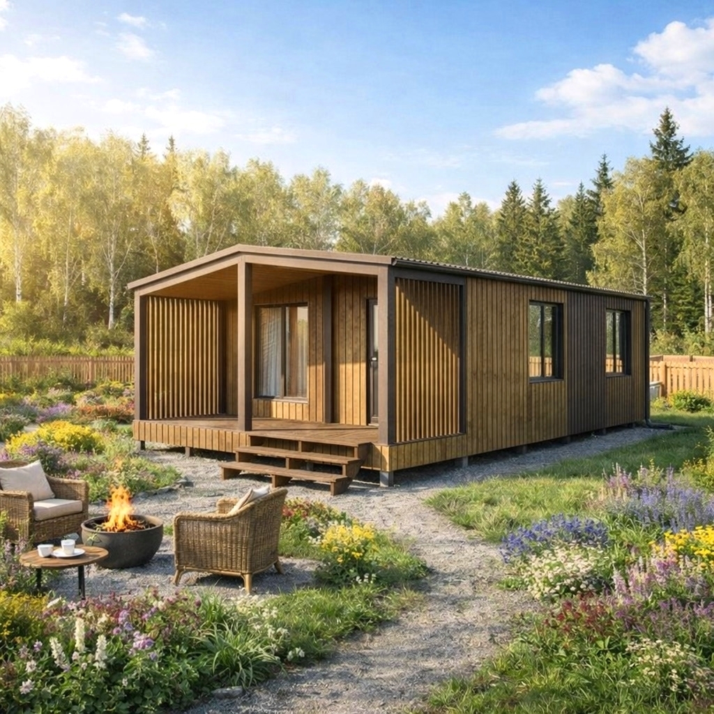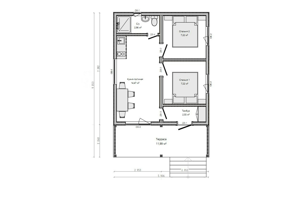 Дом с двумя спальнями и крытой террасой общей площадью 46м2.
