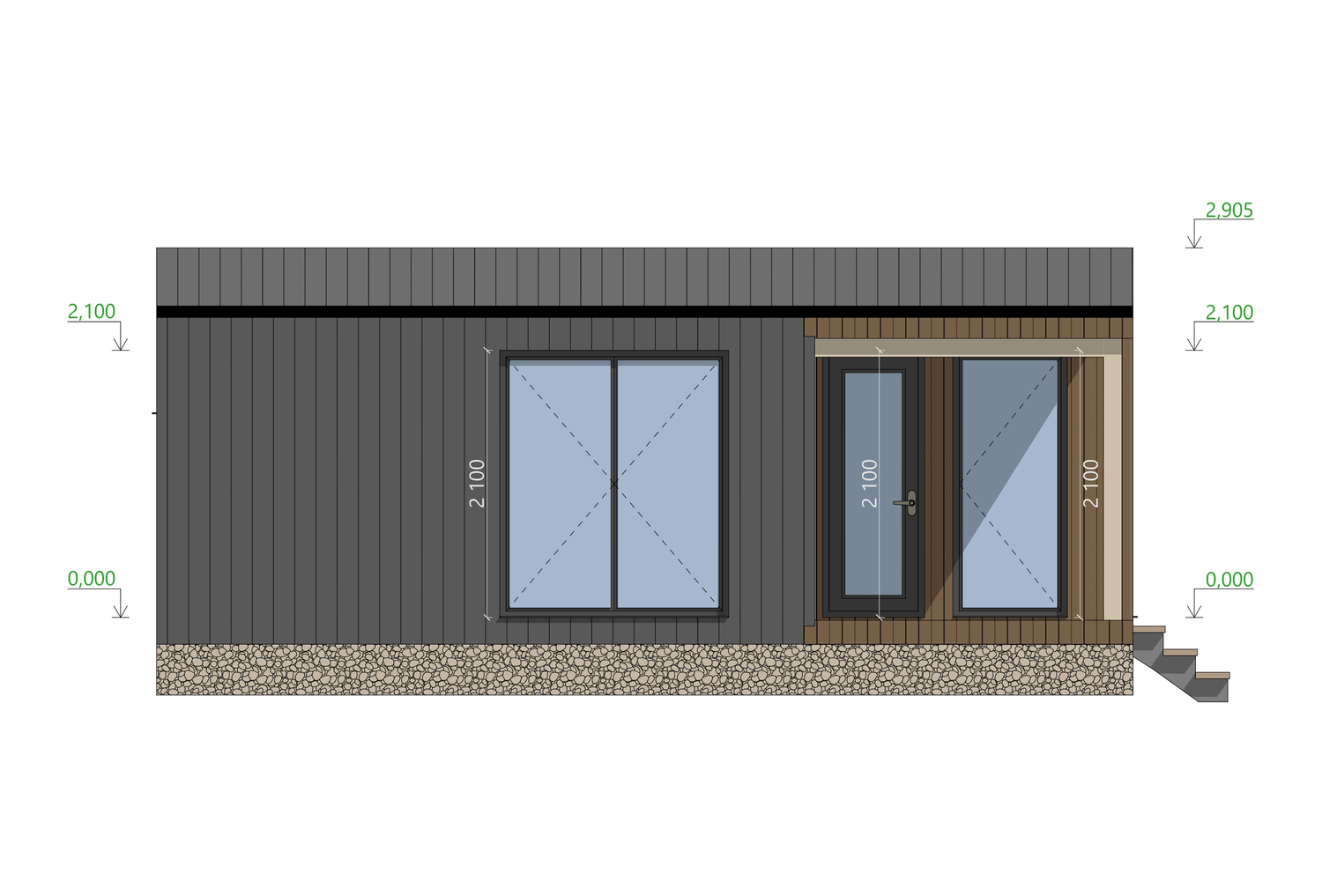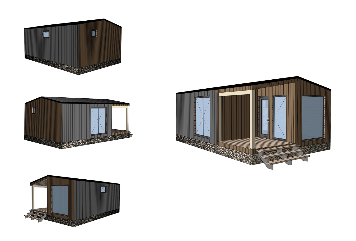 Это идеальный вариант для комфортного проживания двух человек, а так же отлично подойдёт для глемпинга. В данном проекте кухня-гостиная, отдельная спальня где есть возможность установить не только кровать, но и места хранения, а так же просторный санузел.