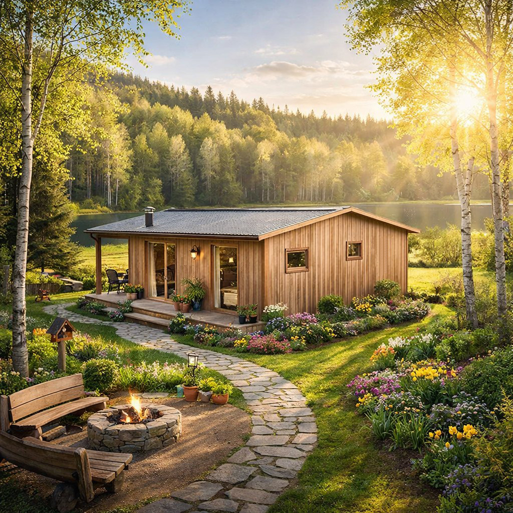 Дом подходит для комфортного проживания семьи с ребёнком, так как имеет 2 небольшие изолированные спальни, очень просторную кухню-гостиную, которую можно трансформировать в разных вариантах расположения мебели.