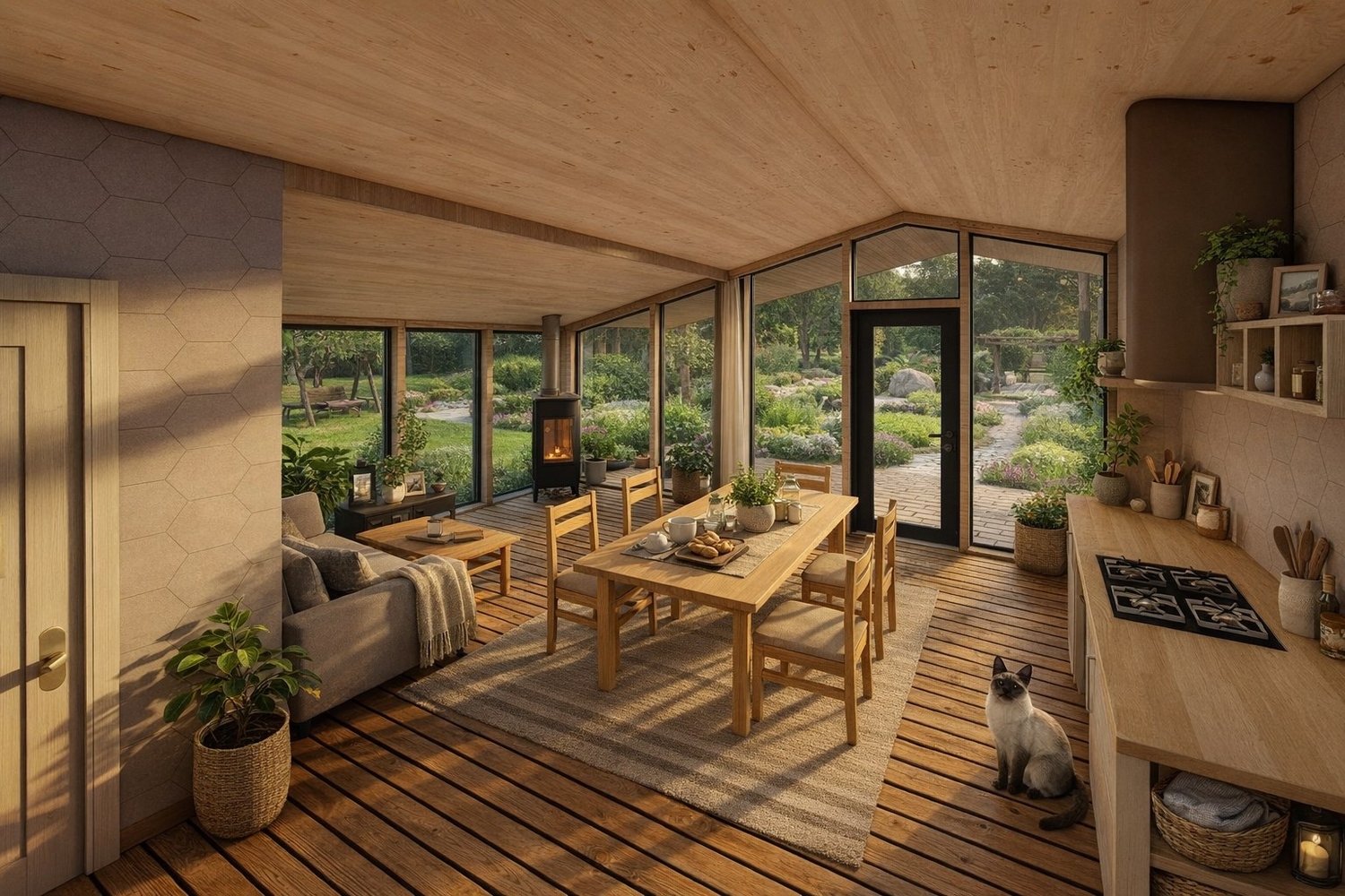 На данный момент самый большой по площади дом в нашем каталоге и подходит для круглогодичного комфортного проживания большой семьи. В нём три спальни, два входа - один из изолированной прихожей, второй с террасы, просторная кухня-гостиная с панорамным остеклением и конечно же терраса.