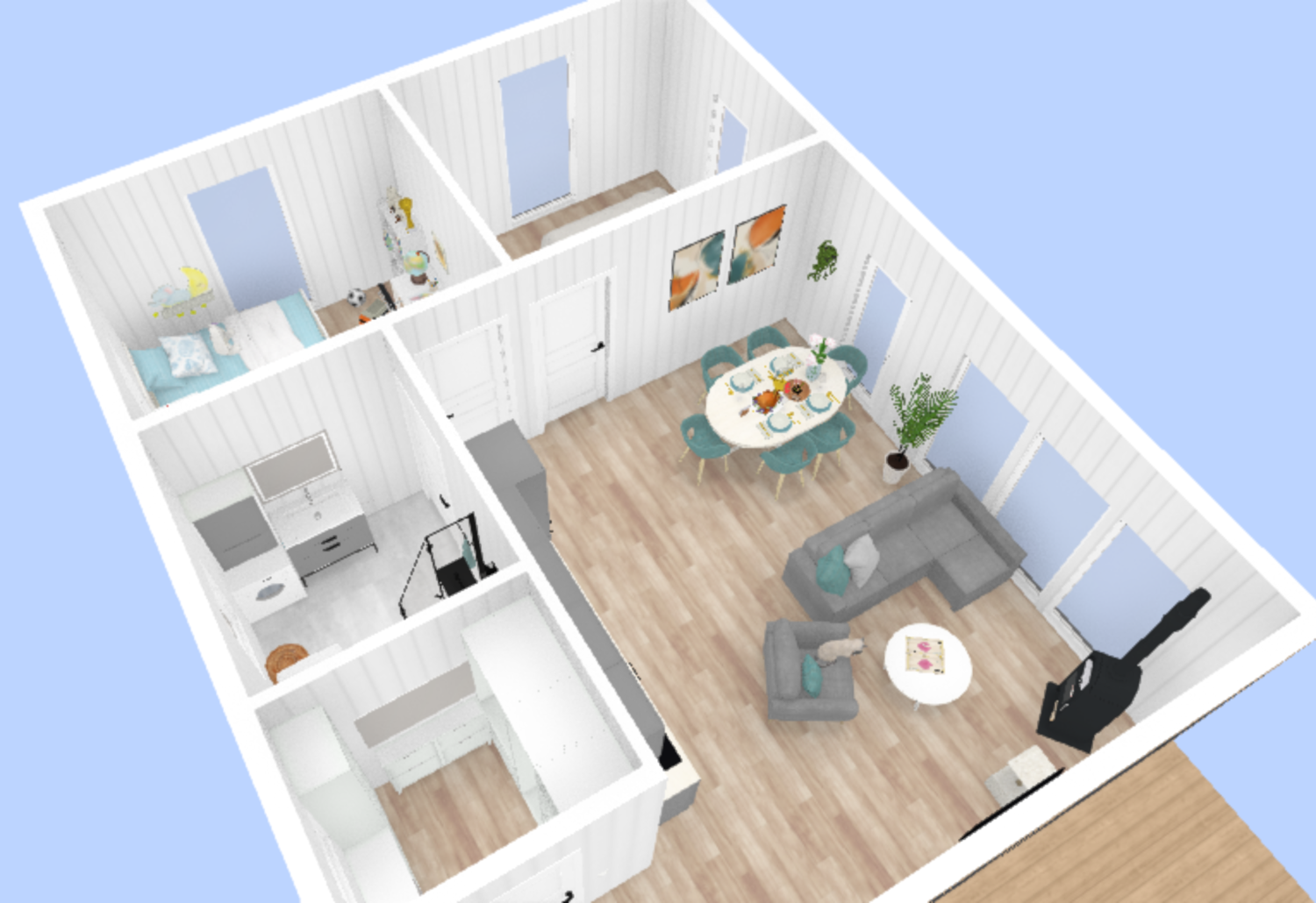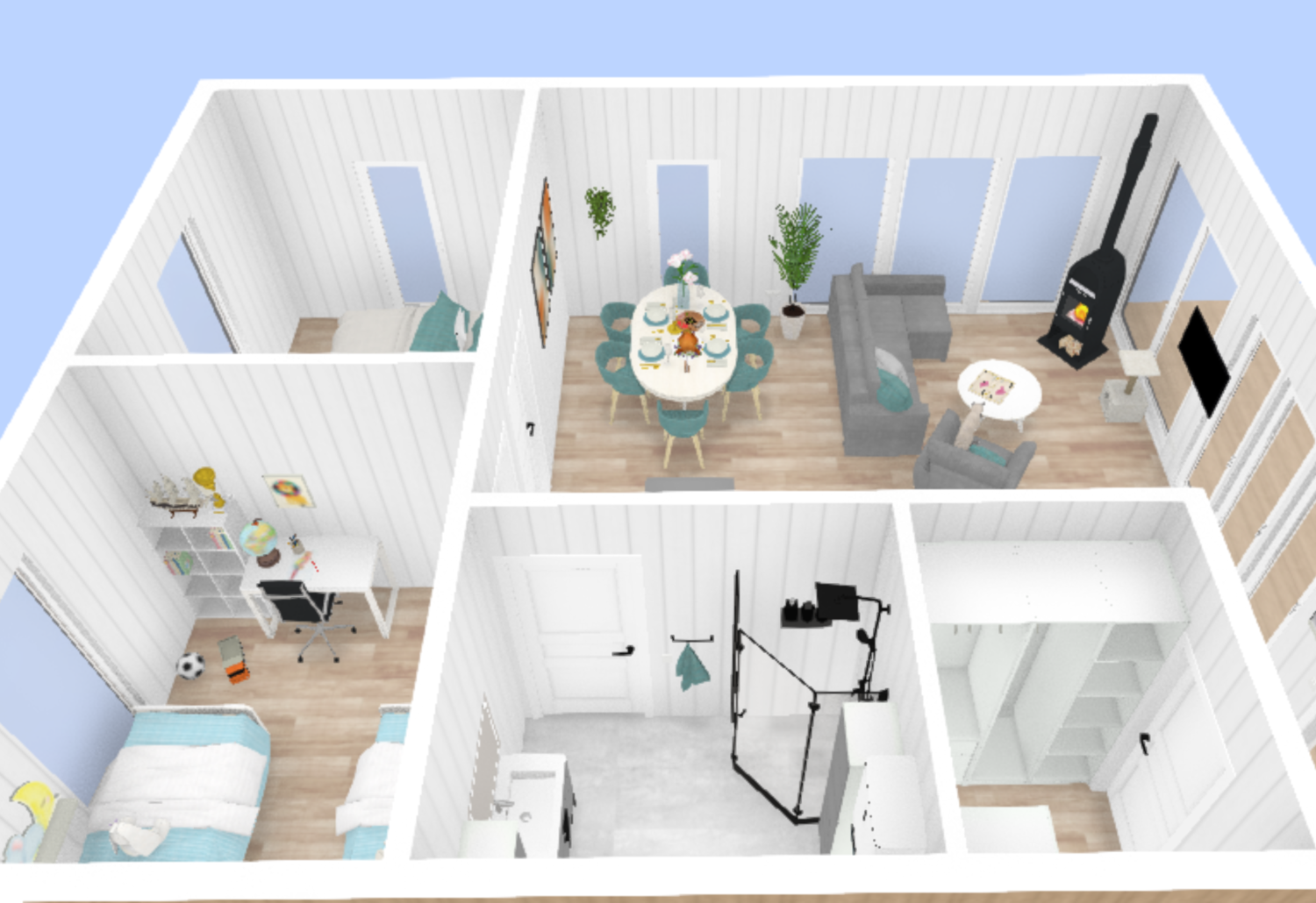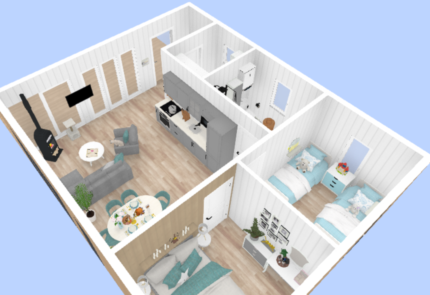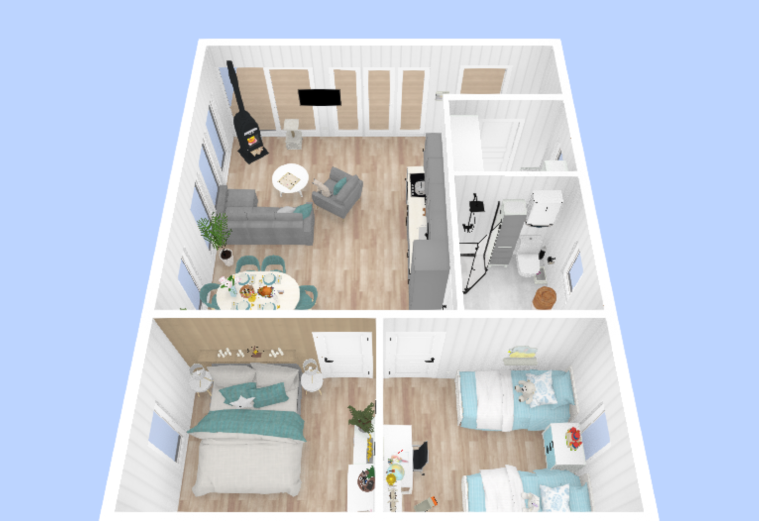 Дом подходит для постоянного проживания семьи с детьми, так как имеет 2 изолированные спальни, очень просторную кухню-гостиную, большой санузел, где найдётся место не только под базовый минимум, но и под места хранения и стиральную машину, и, что не маловажно, отдельную гардеробную комнату.