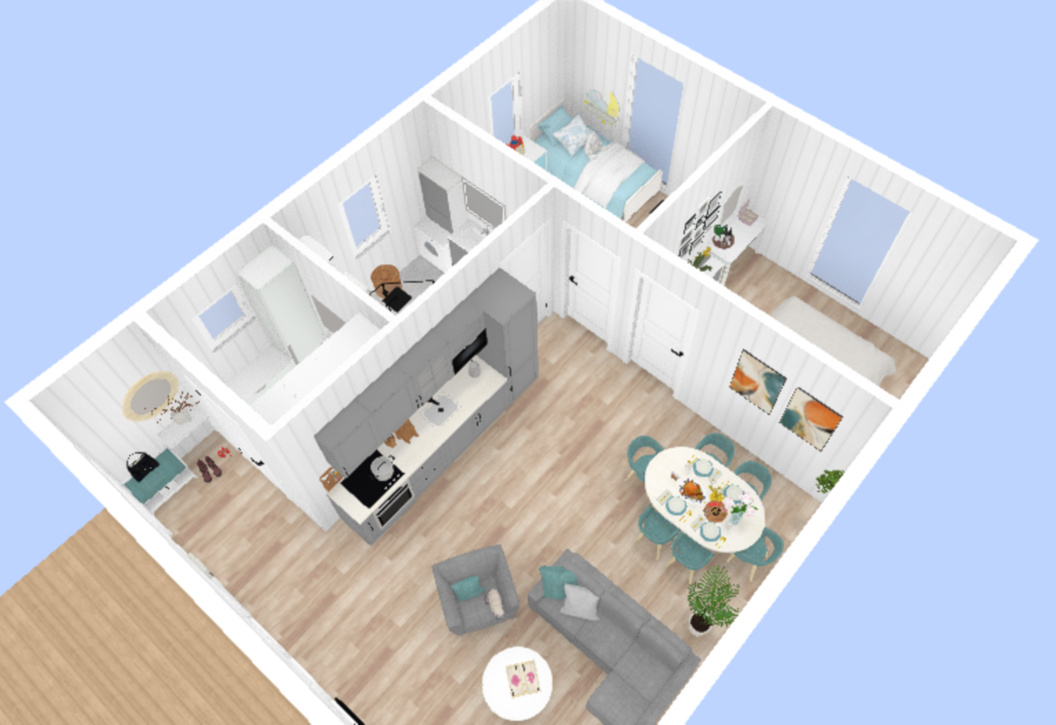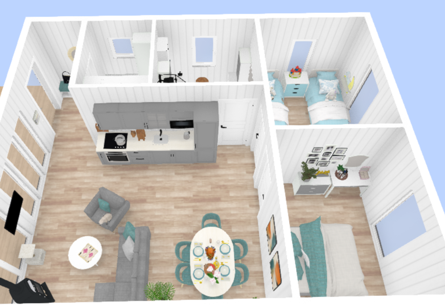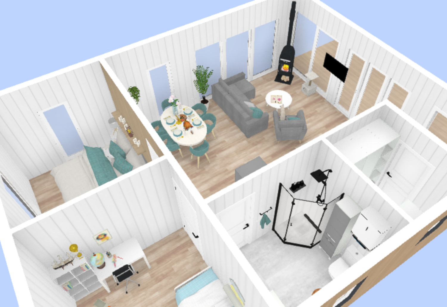 Дом подходит для постоянного проживания семьи с детьми, так как имеет 2 изолированные спальни, очень просторную кухню-гостиную, большой санузел, где найдётся место не только под базовый минимум, но и под места хранения и стиральную машину, и, что не маловажно, отдельную гардеробную комнату.