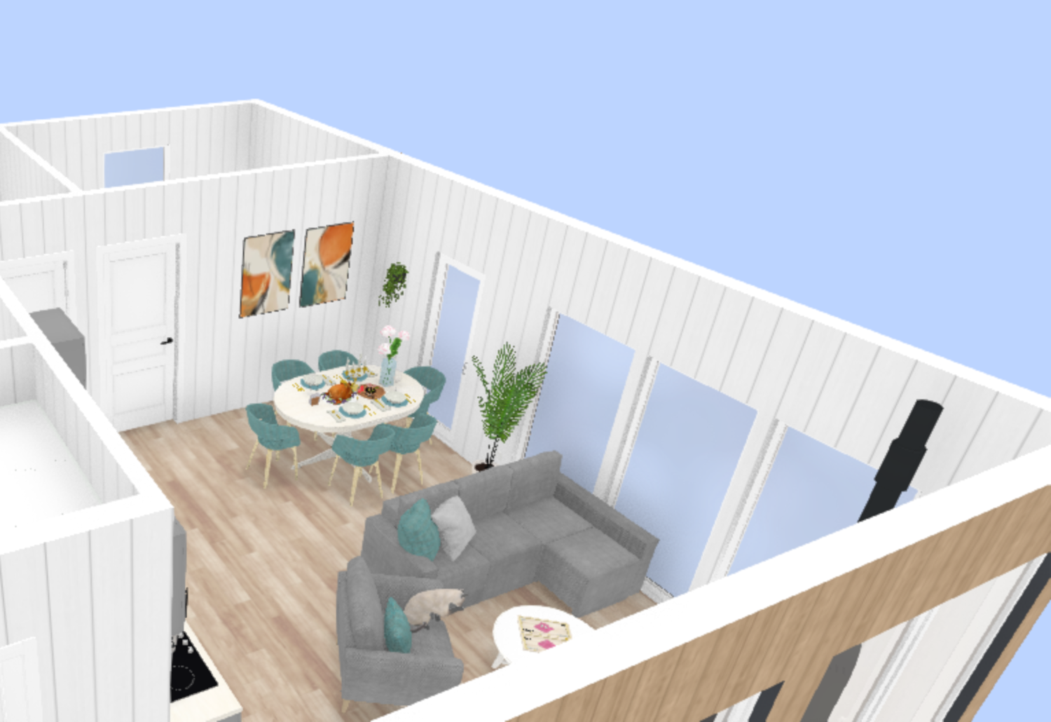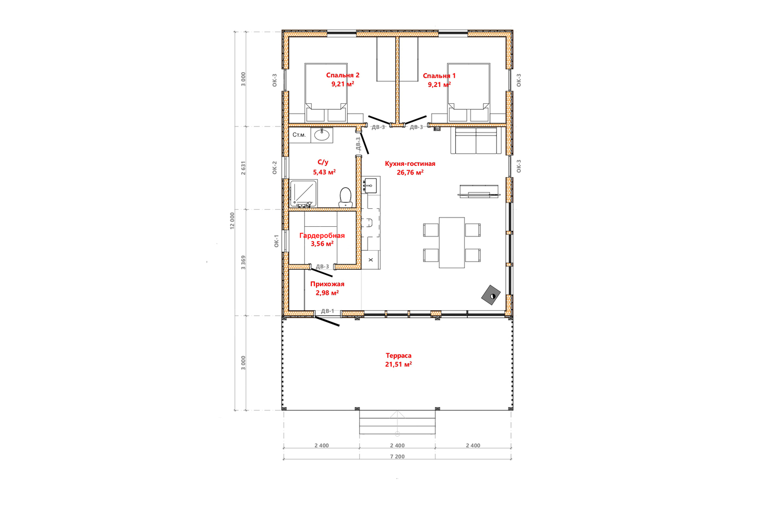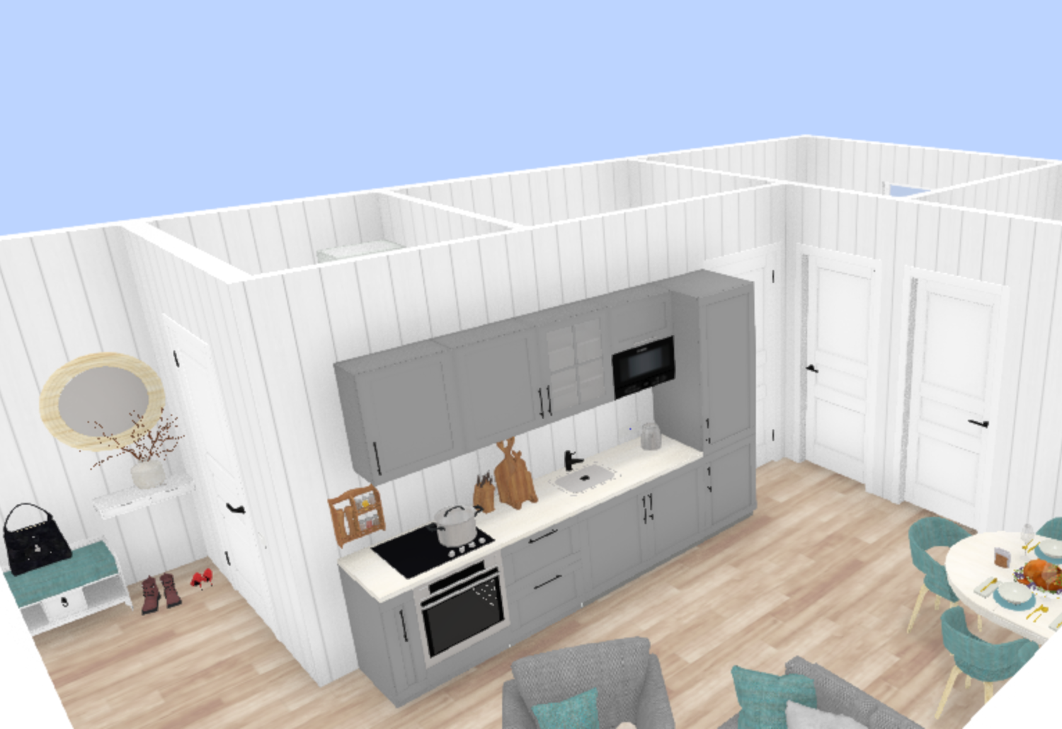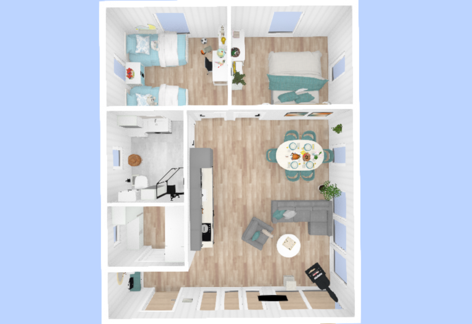 Дом подходит для постоянного проживания семьи с детьми, так как имеет 2 изолированные спальни, очень просторную кухню-гостиную, большой санузел, где найдётся место не только под базовый минимум, но и под места хранения и стиральную машину, и, что не маловажно, отдельную гардеробную комнату.