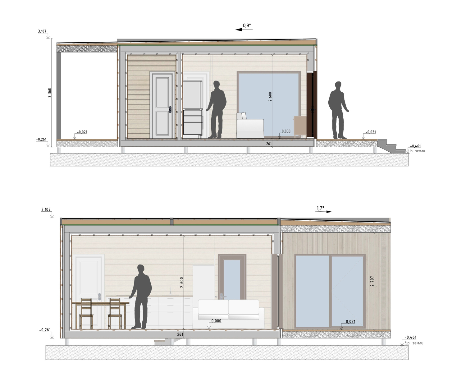 Комфортабельный дом с одной спальней, простороной кухней-гостиной и большим совмещённым санузлом. Вход в дом находится с обратной стороны дома. При прихожей есть отдельное помещение которое можеть быть и как техническое, так и гардеробной. Панорамное остекление с видом на участок и выходом на террасу есть и из кухни-гостиной, и из спальни.шие панорамные окна.