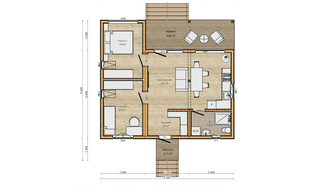 Общая площадь, включая террасу и крыльцо: 64,16м2.